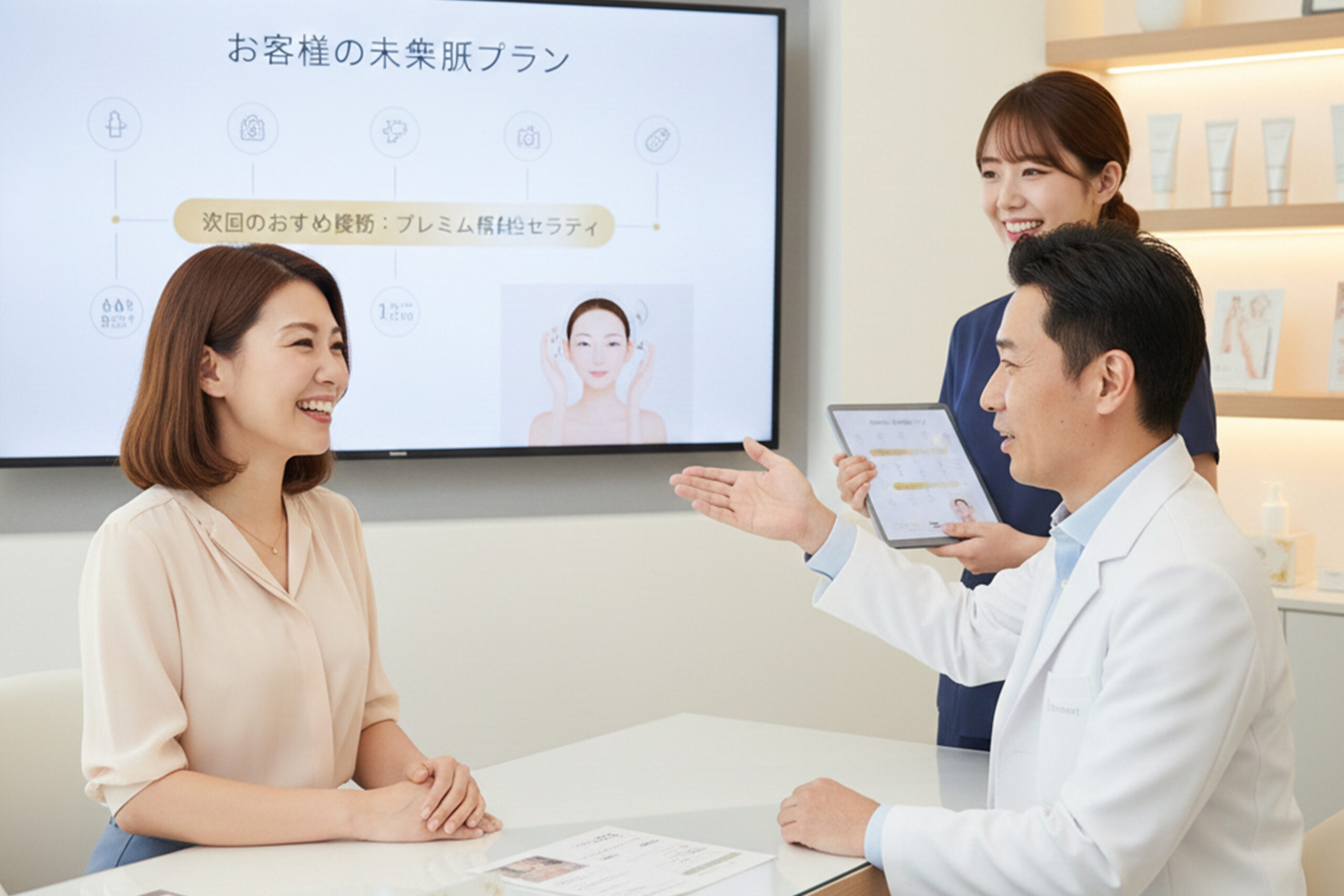 施術が成功した瞬間が、患者様との関係の始まりです。施術効果の維持や、次に起こりうるお肌の変化について、パーソナライズされた情報提供とタイムリーなフォローアップを行いましょう。予約システムと連動した「次回のおすすめ施術」の提案メールや、施術から一定期間後に個別メッセージを送ると、「私のことを気にかけてくれている」という安心感と信頼感を生み、再来院の動機づけになります。
