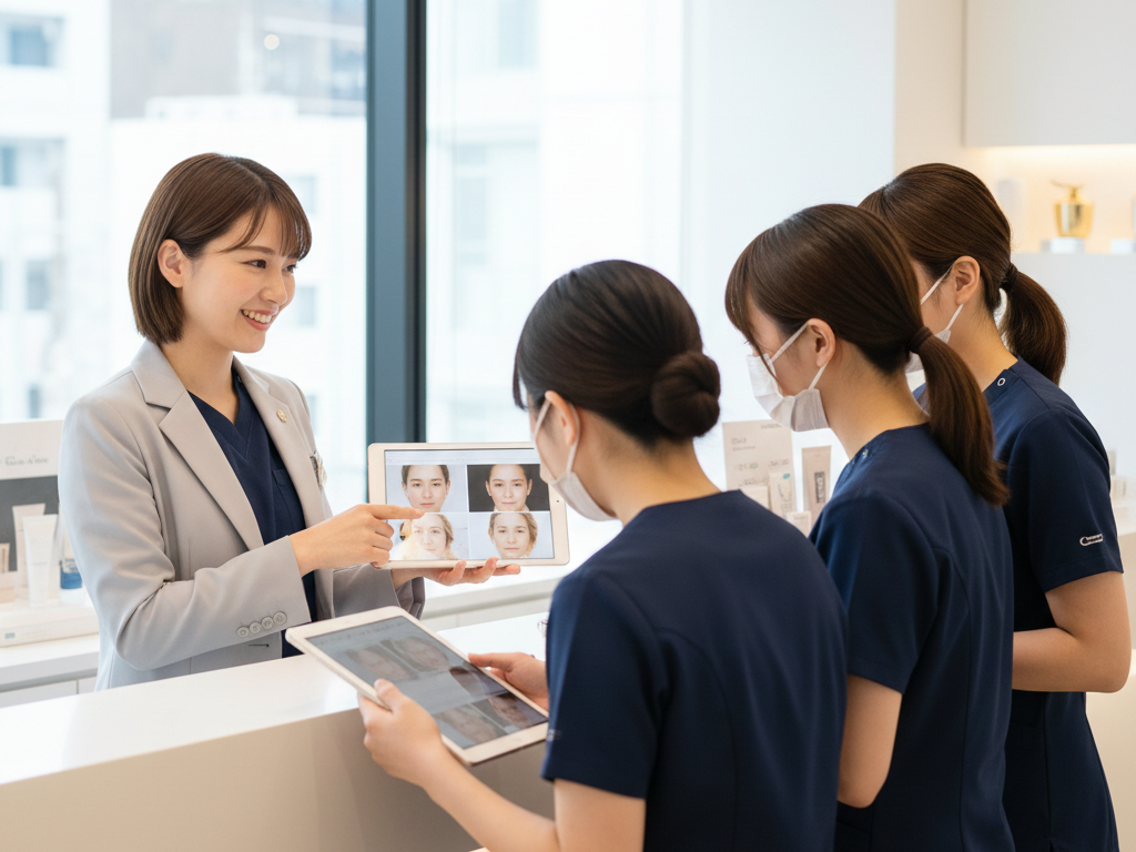 接客、カウンセリング、施術の手順はもちろん、クレーム対応や清掃基準に至るまで、誰がやっても同じ結果が出るように言語化します。これにより、多店舗でも「クリニックのブランド」を均一に保つことができます。