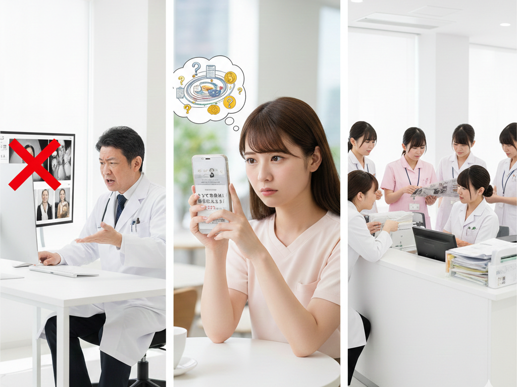 自由診療の心理障壁: 数千円の買い物とは違い、自費診療には「不安」や「葛藤」が伴います。患者様の深い悩みや、コンプレックスに寄り添う心理的導線が描けない広告は、結局「安さ」で釣るしかなくなります。