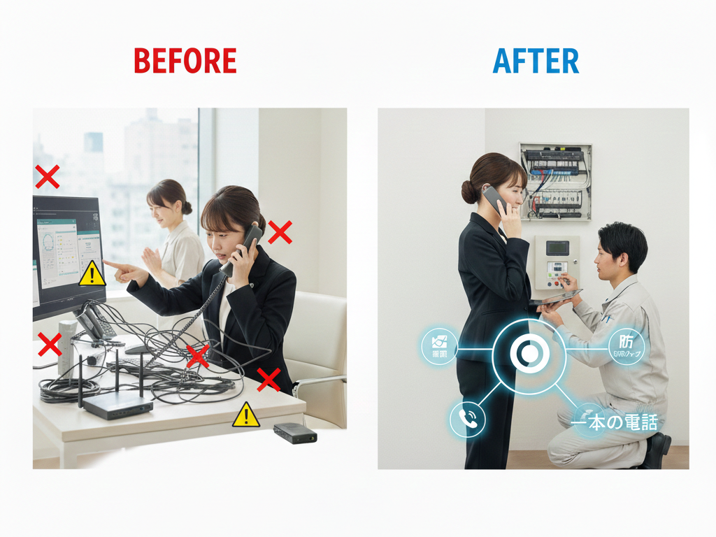 復旧までのスピード: 電話・ネット・防犯システムが連携して動いている場合、一括管理であればシステムの相性問題を即座に特定でき、業務が止まる「ダウンタイム」を最小限に抑えられます。