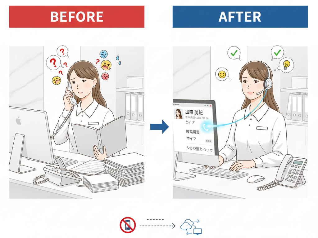 従来の電話対応では、氏名の漢字確認や電話番号の照合、過去の履歴検索といった「事務的な確認作業」に多くの時間を費やしていました。しかし、CTI導入によってこれらの作業はほぼゼロになります。