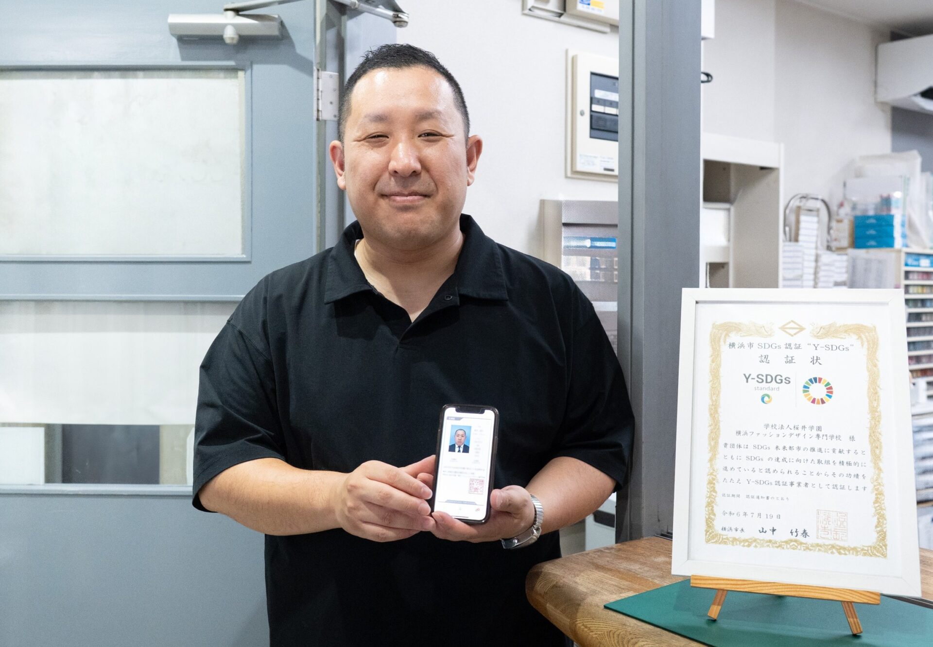 当校は、横浜市鶴見区にある神奈川県で唯一のファッション専門学校です。3年制で、昼間部・夜間部・留学生部があり、約300名の学生が学んでいます。デジタル学生証に関心を持ったきっかけは横浜市SDGs認証制度「Y-SDGs」でした。これは、SDGsの達成に向けて活動している企業や団体を横浜市が認証する制度です。当校は、使われなくなったスカーフやカーテンを再利用したドレス制作などの活動が評価され、2023年度にスタンダード区分で認証を取得しました。そして次なるSDGsへの取り組みとして学生証のペーパーレス化を検討しようとしていた折、東通さんからデジタル学生証『MyiD』のご案内を受け、それをきっかけにお話を伺いました。