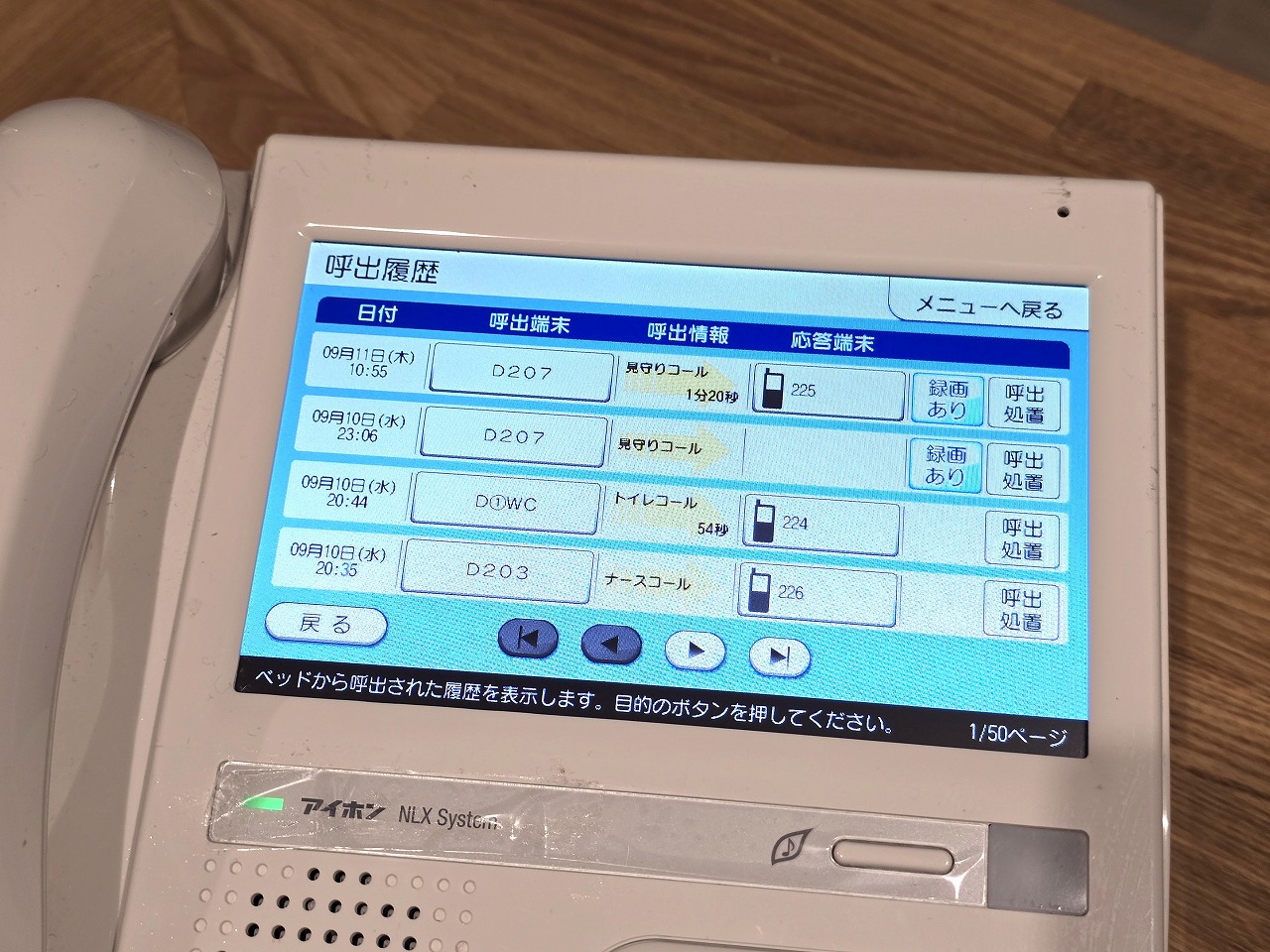 ナースコールは入居者様の状態に合わせて、押すだけのタイプと会話ができるマイク付きのタイプを使い分けています。会話可能な入居者様の場合は、現場に急行せずとも済む場合も多いですね。通知が重なった際も、映像と会話により優先順位がつけやすくなり、特に夜勤時の見回り回数や訪室回数も減って、職員の精神的・身体的負担が軽減。その分の時間を他の作業に充てることができるようになり、業務効率が向上しました。ナースコールの解除ボタンも居室に入ってすぐの場所にあるので、対応しやすいです。