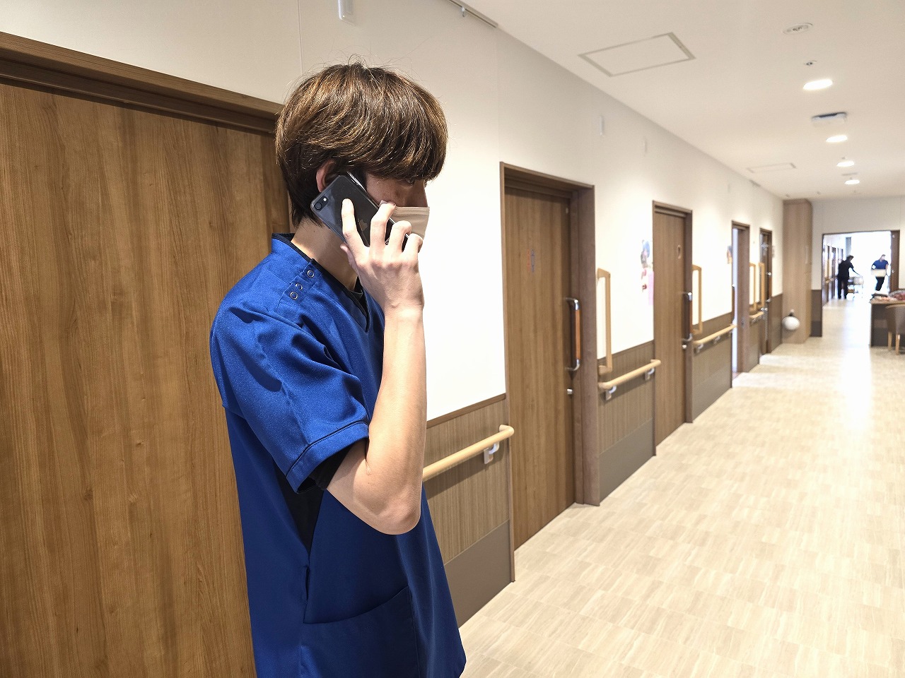 従来の施設では、子機にPHSを導入するのが主流だったと思います。私も以前の職場ではPHSを使っていましたが、今回、スマホの導入によって操作性が大幅に向上したことを実感しています。画面が大きく見やすいだけでなく、見守りカメラの鮮明な映像も届くため、必要な情報を瞬時に確認できます。たとえば、夜間の巡回時や介護計画の確認の際にも、手元のスマホで状況を把握できるため、作業の効率が格段に上がりました。さらに、あらかじめ入力しておいた各入居者様の注意点やケア内容も通知されるため、情報の抜け漏れ防止にもつながります。職員はみな、普段からスマホを使っているので、すぐに使い方を覚えられたのも良かったですね。職員間での情報共有もスムーズになっています。
