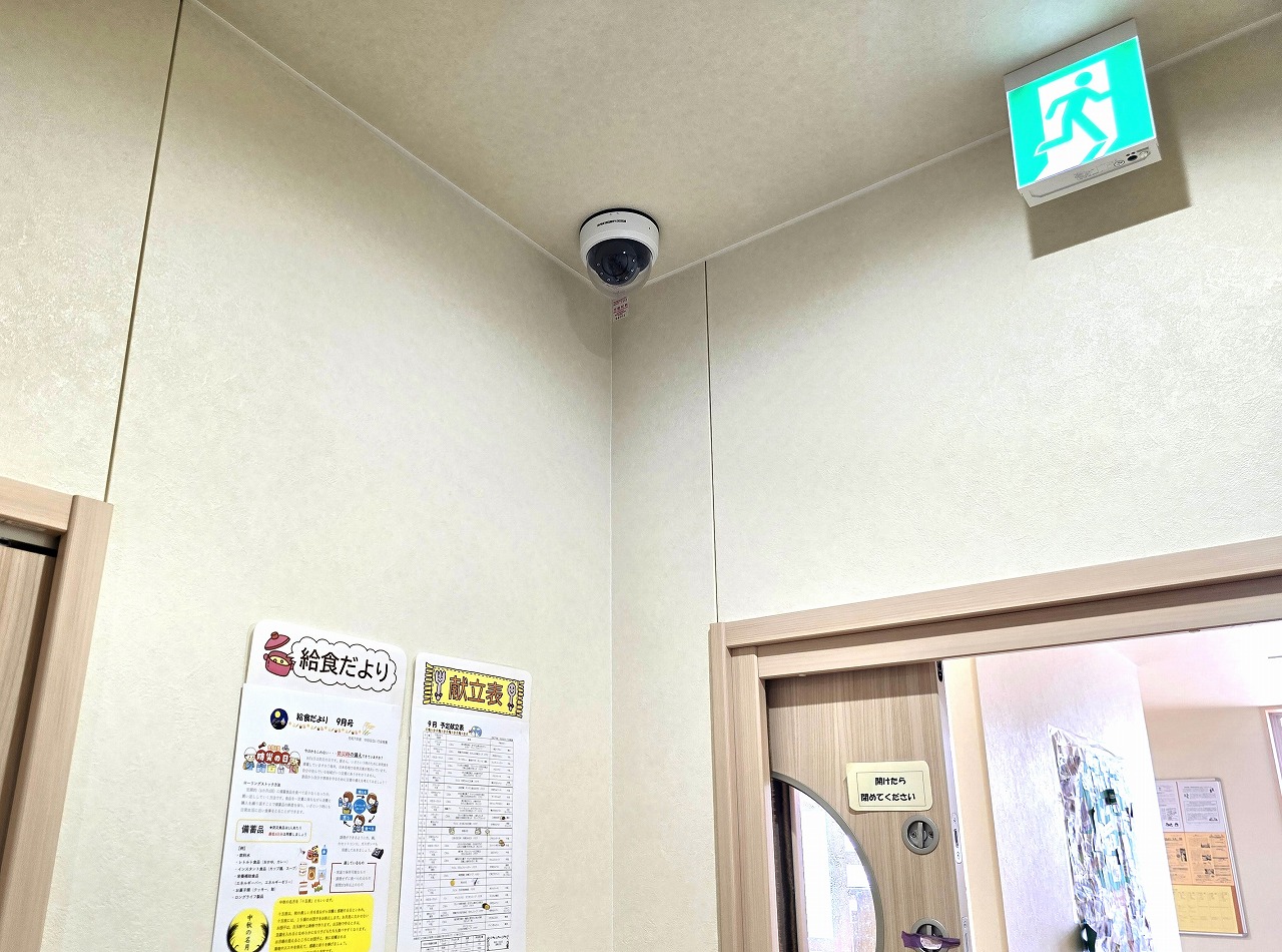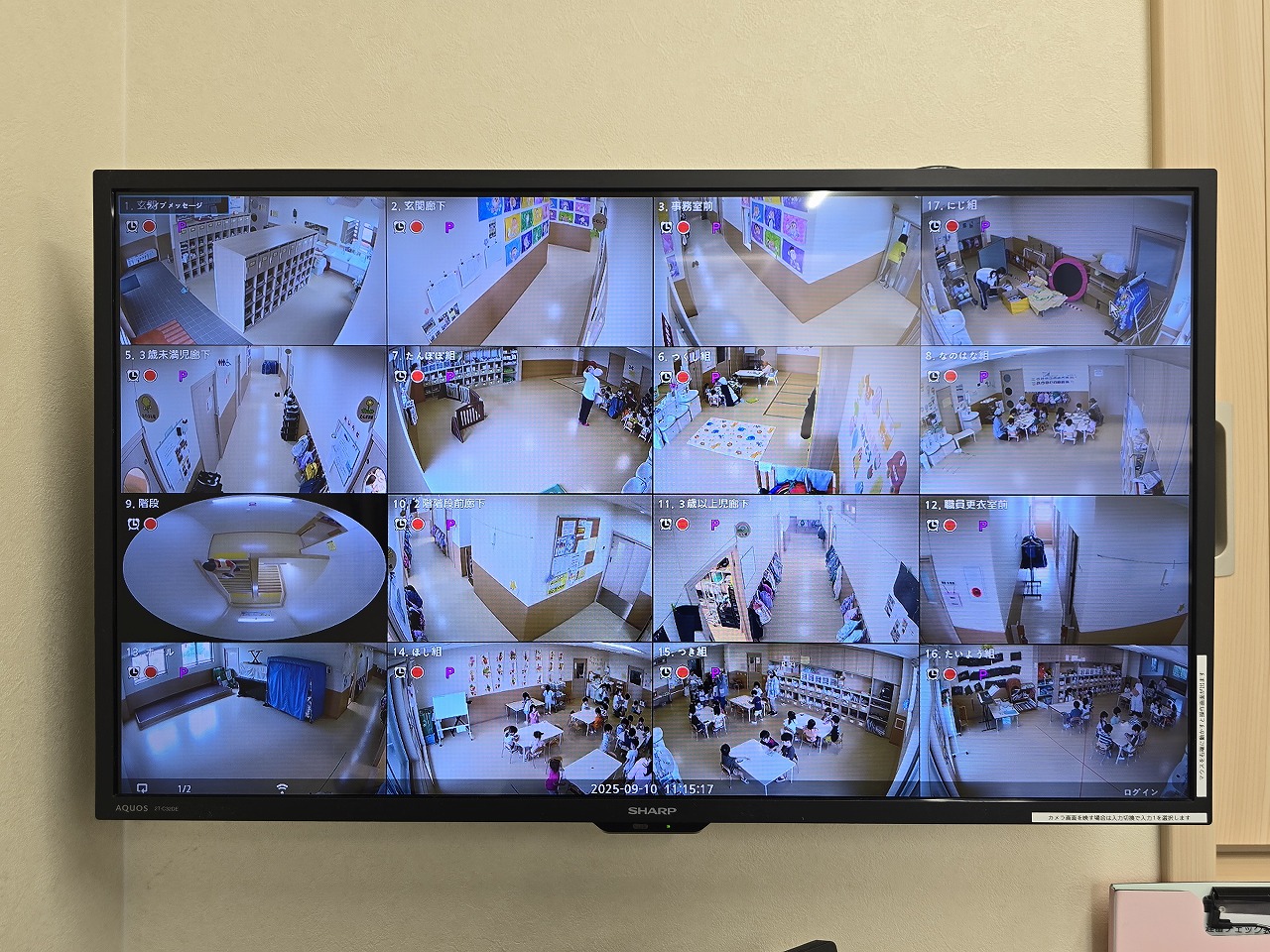 中田なないろ保育園は、当法人で4つ目の保育園となります。これまでの3園でもネットワークカメラを導入して公開保育を実施しており、保護者の皆様から好評だったため、当園でも開設と同時に導入を決めました。一番の目的はもちろん、園児の安全を守ることです。各教室や廊下、事務室、入口にドーム型カメラ、階段には全方位カメラを設置して園全体をカバー。映り込む範囲や角度などの細かな調整を東通さんに行っていただき、事務所のモニターで全映像を確認できるほか、先生方は各自のスマホから自分の教室の様子を見られるようになっています。映像も鮮明で、教室のカメラからは音声も届くため、日々の安全管理にとても役立っています。