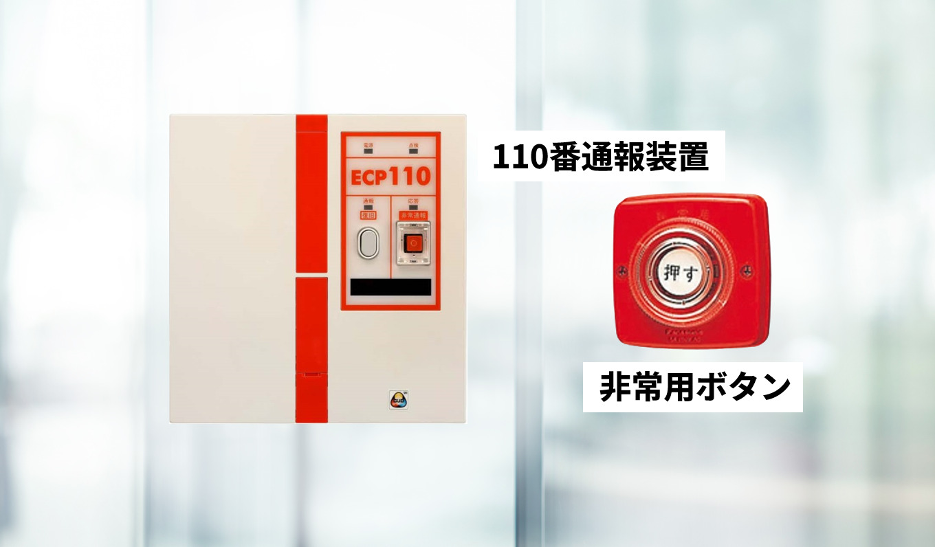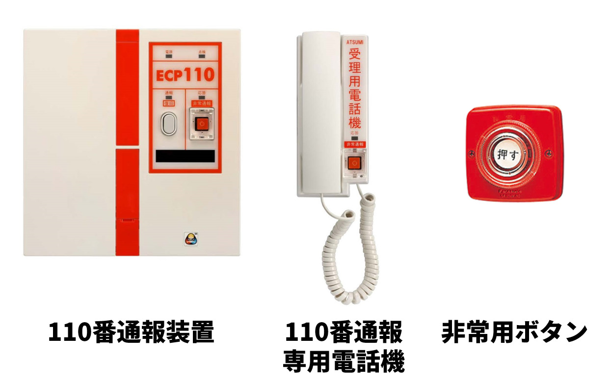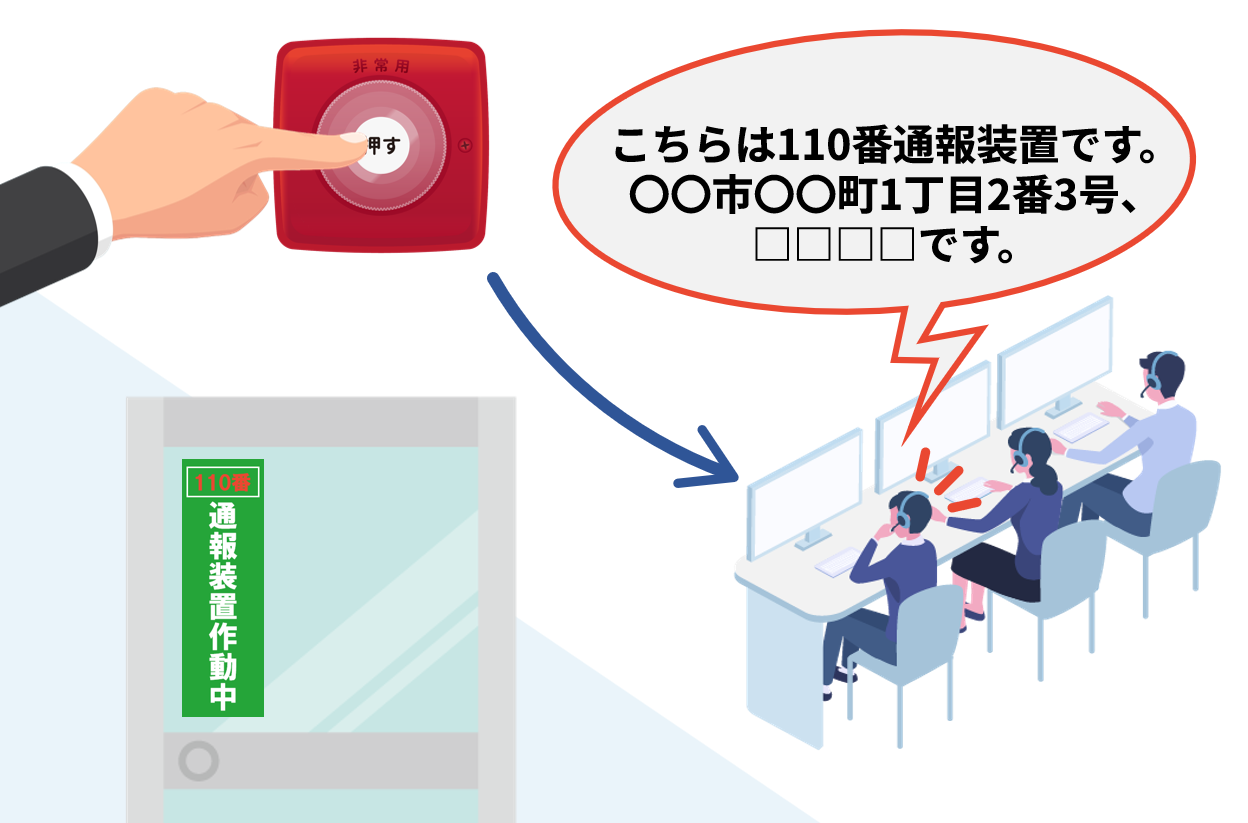 「110番通報装置」は、非常用ボタンを押すだけで警察へ自動通報できる装置です。電話機で110番を押して状況を説明する場合と比べ、より迅速な通報を行うことができるようになります。