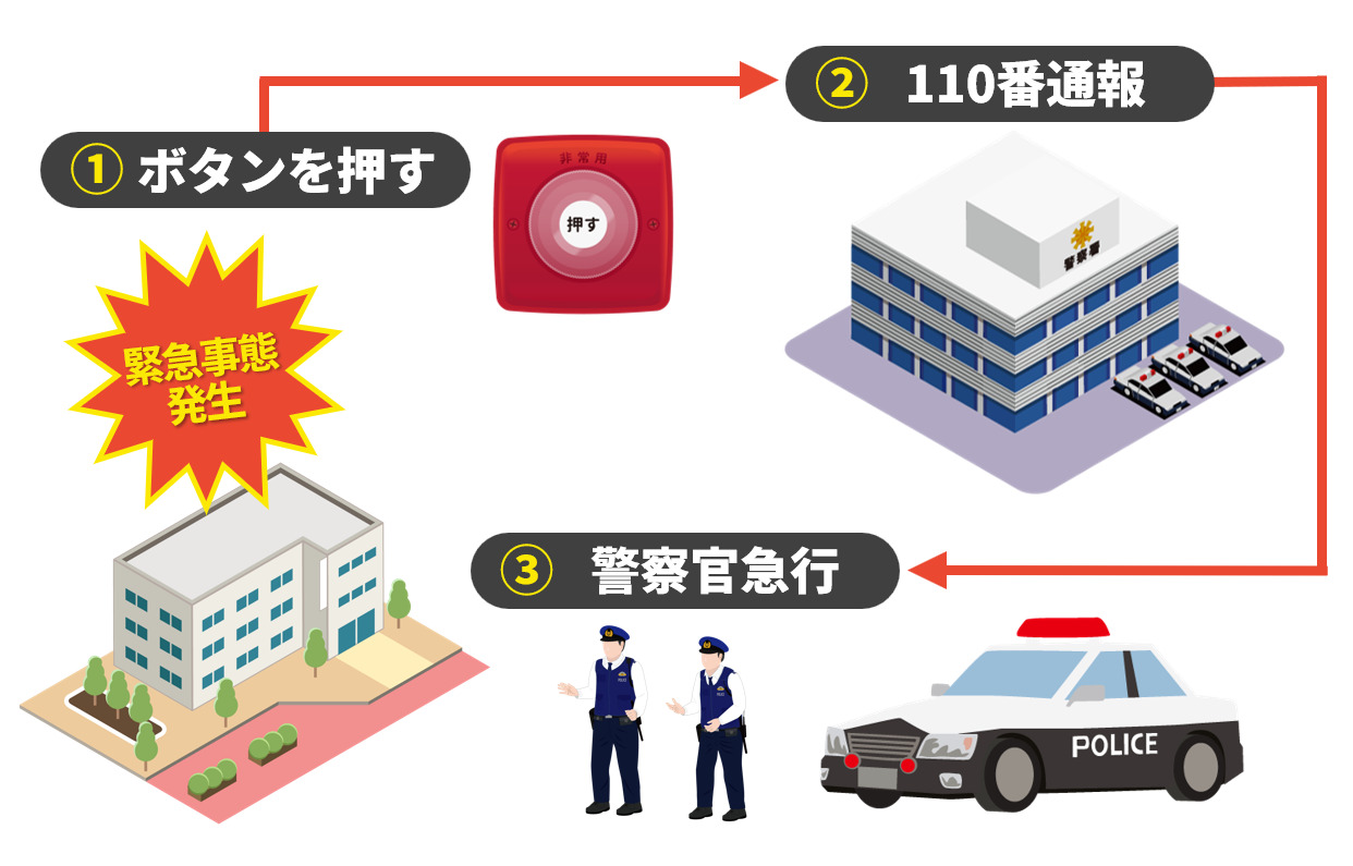 不審者の侵入や来訪者とのトラブル、暴力・危険行為など、一分一秒を争う緊急事態が発生した場合、落ち着いて110番通報を行うことは簡単ではありません。