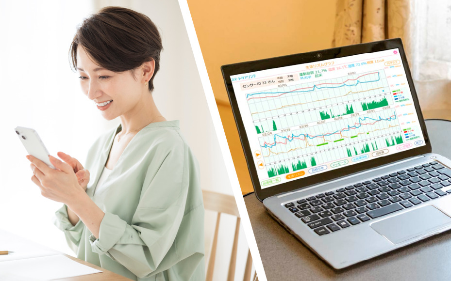 「みぃるも」では、集めたデータをグラフでご覧いただくことも可能です。データはスマートフォンやパソコンからいつでもチェックでき、ご家族の活動の様子がひと目で把握できます。日々の生活リズムのちょっとした変化も把握しやすく、離れて暮らしていても安心して見守ることができます。