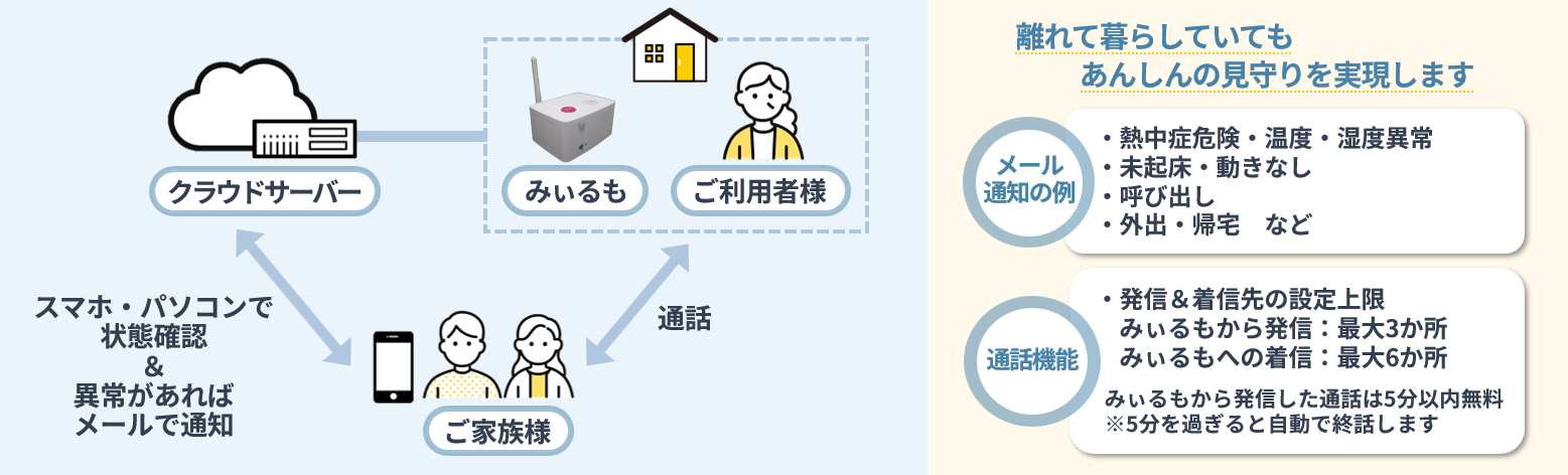 その点、「みぃるも」は、インターネット不要で使用でき、特別な設定や工事も必要なく、どなたでもかんたんに始められるのが大きな特徴です。