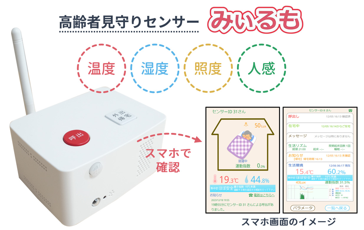 お部屋に置くだけで見守りできる、家庭向け見守りセンサー。ご家族の生活リズムをスマホで気軽にチェックできるので、離れて暮らしていても安心です。
