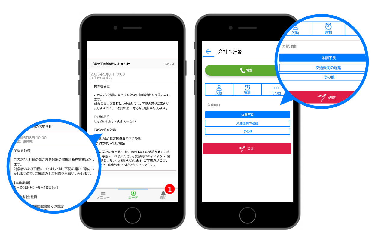 スマホアプリから欠勤・遅刻などの連絡が可能です。通話機能にも対応し、スムーズな情報共有を実現します。