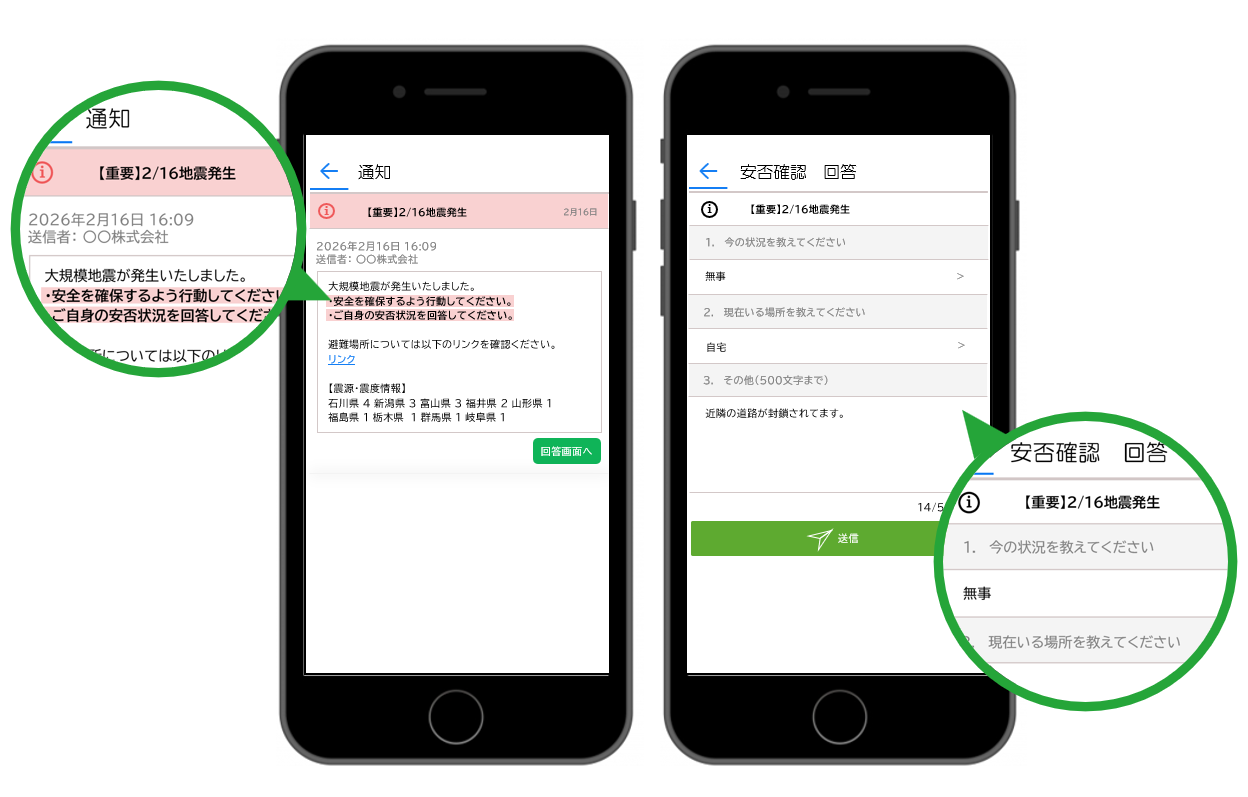 地震発生などの緊急時に、自動または手動で安否確認の一斉通知を送信することができます。