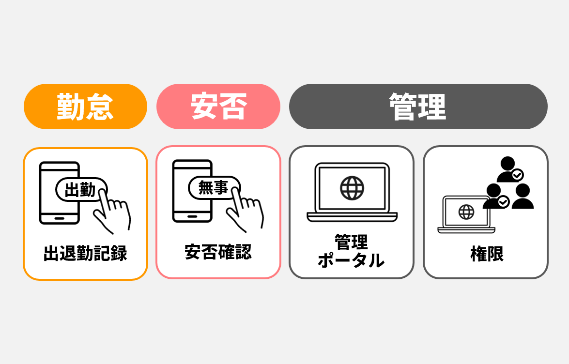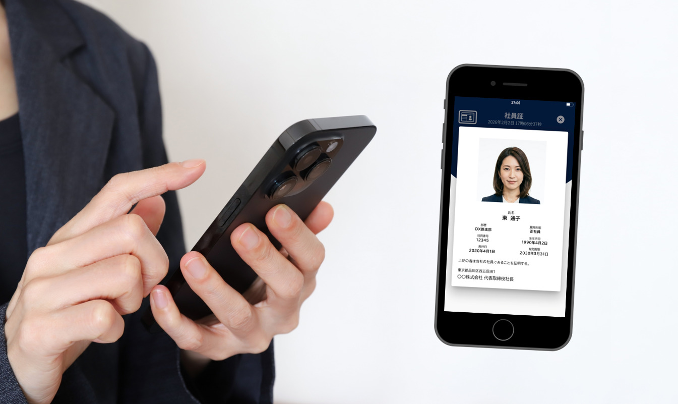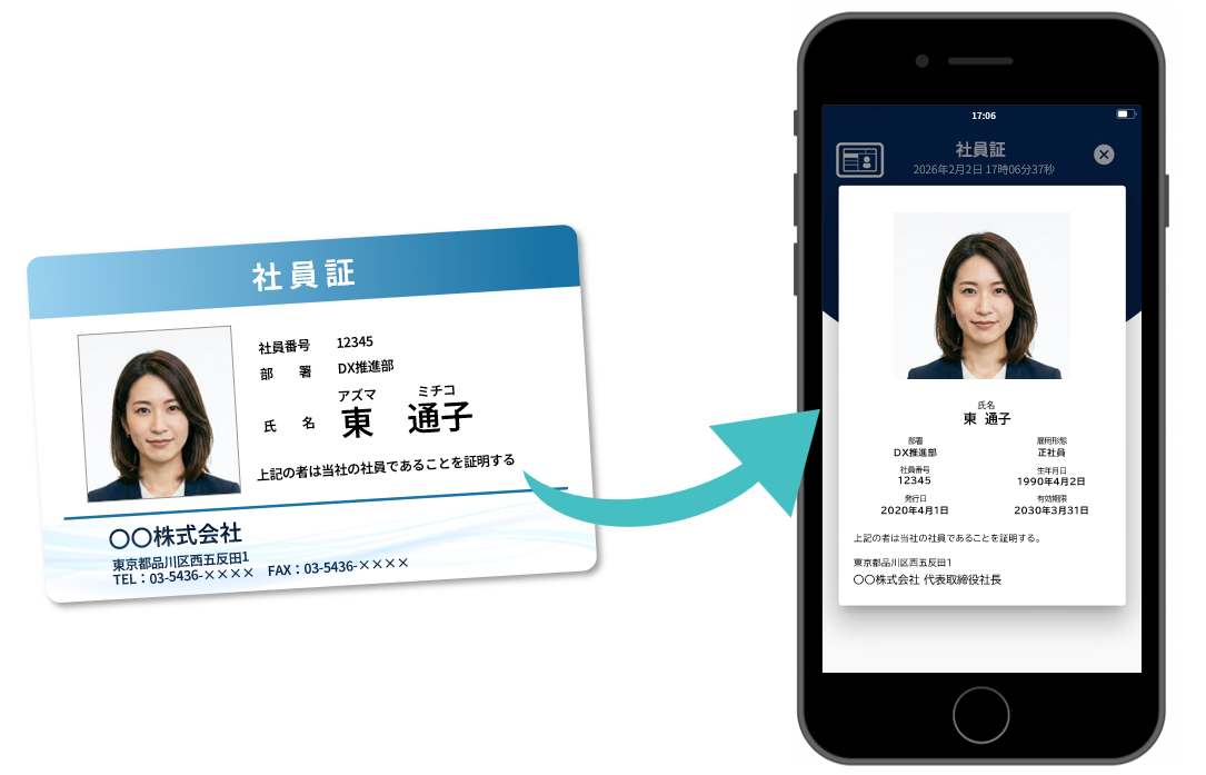 スマホアプリで社員証・入館証をはじめとした身分証をデジタル化。勤怠・連絡・安否確認もひとつにまとめ、便利で効率的な運用を実現します。