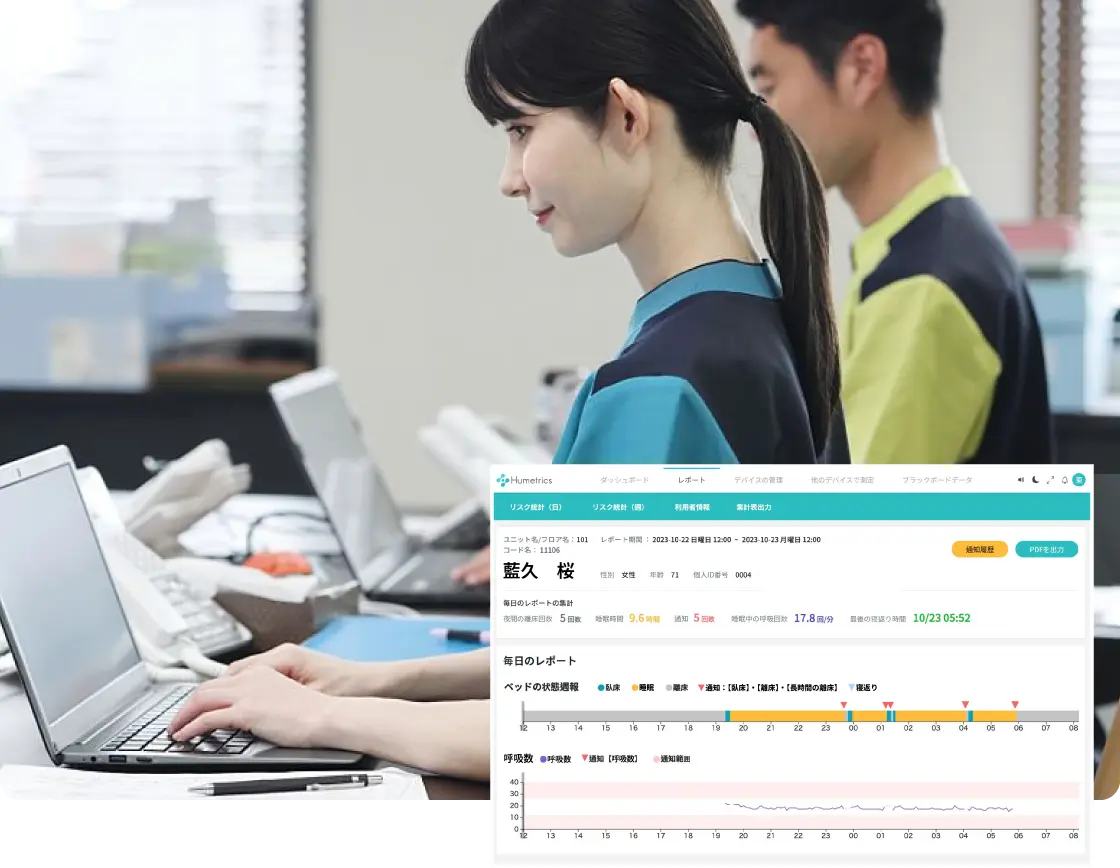 睡眠時間や夜間の離床回数などを自動で記録・分析し、睡眠の状態がひと目で把握できるレポートを自動作成します。