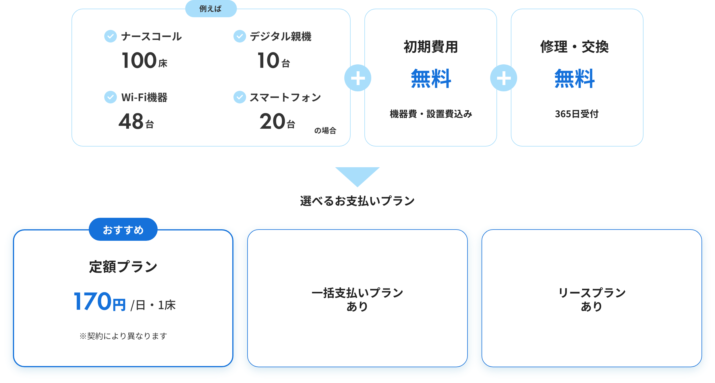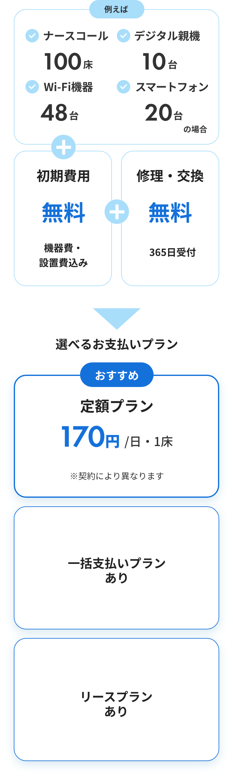 お支払い方法は、一括支払いやリースの他に、1日あたり1床170円(※契約により異なります)で導入いただける定額プランのご案内も行っております。ご契約期間中は毎月のお支払い金額が一定となるため、年間の予算計画が立てやすいプランです。詳細についてはぜひお問い合わせください。